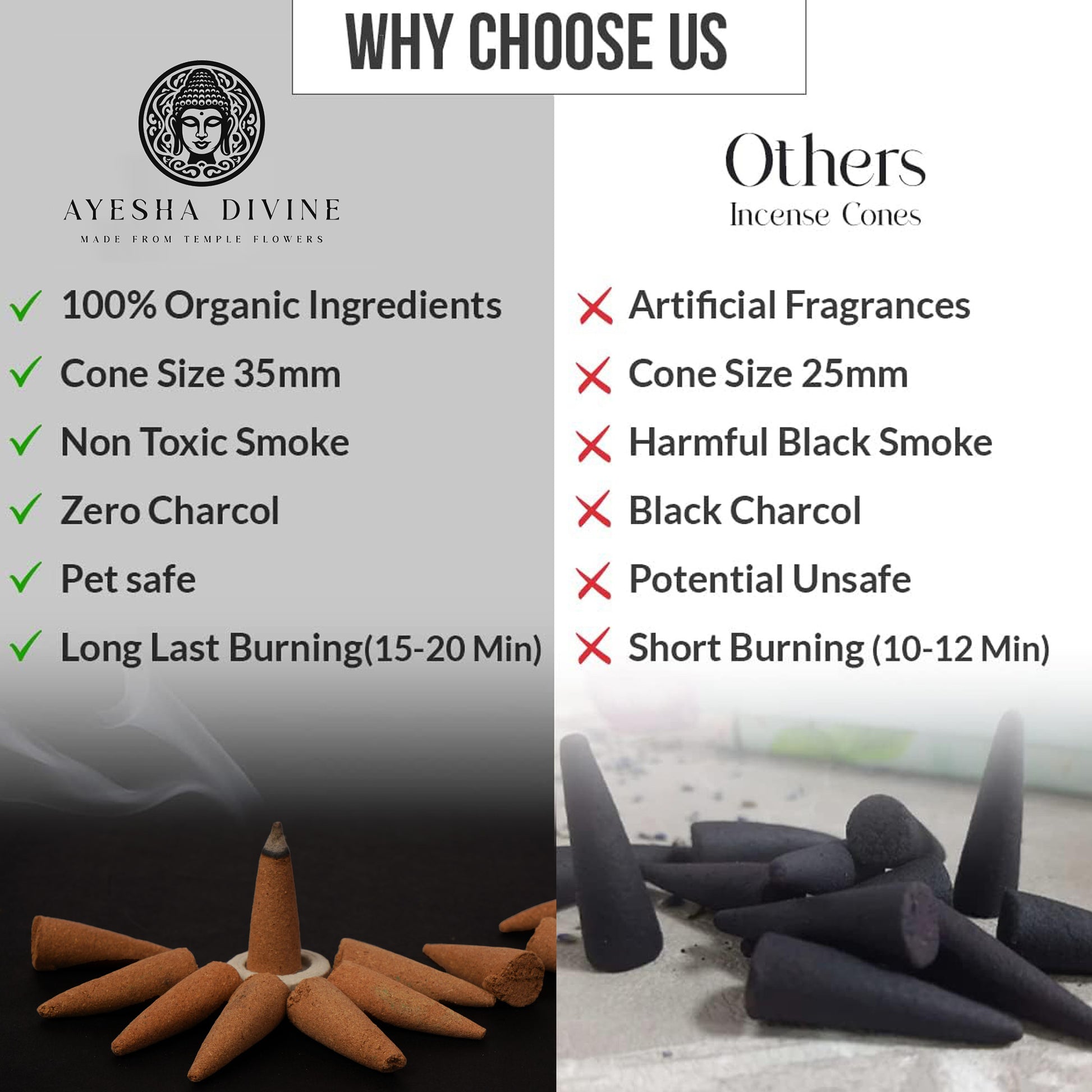 Bring home the essence of the Vedas with our Ayesha Divine Premium Incense Cones, carefully hand-rolled and made from recycled temple flowers, natural resins, honey, aromatic woods, and pure essential oils. Free from charcoal and toxins, these incense cones release a long-lasting, clean burn (15–20 minutes) that fills your space with peace, clarity, and divine energy.