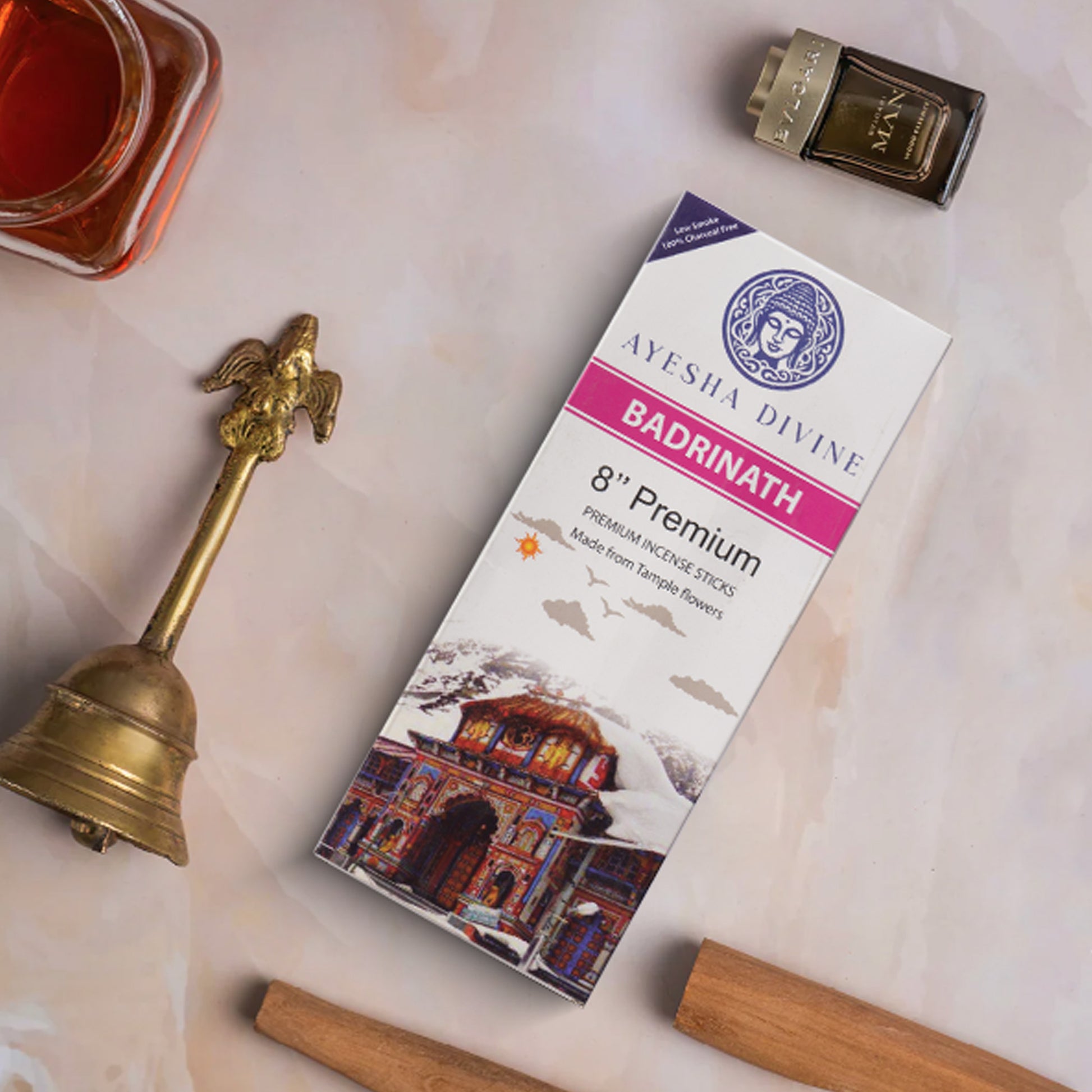 Handcrafted from temple flowers, Ayesha Divine’s Badrinath Premium Incense Sticks bring you the essence of spirituality, purity, and peace. Each 8-inch bamboo-free incense stick burns cleanly, filling your space with a long-lasting, heavenly aroma that lingers in the air and in the soul.