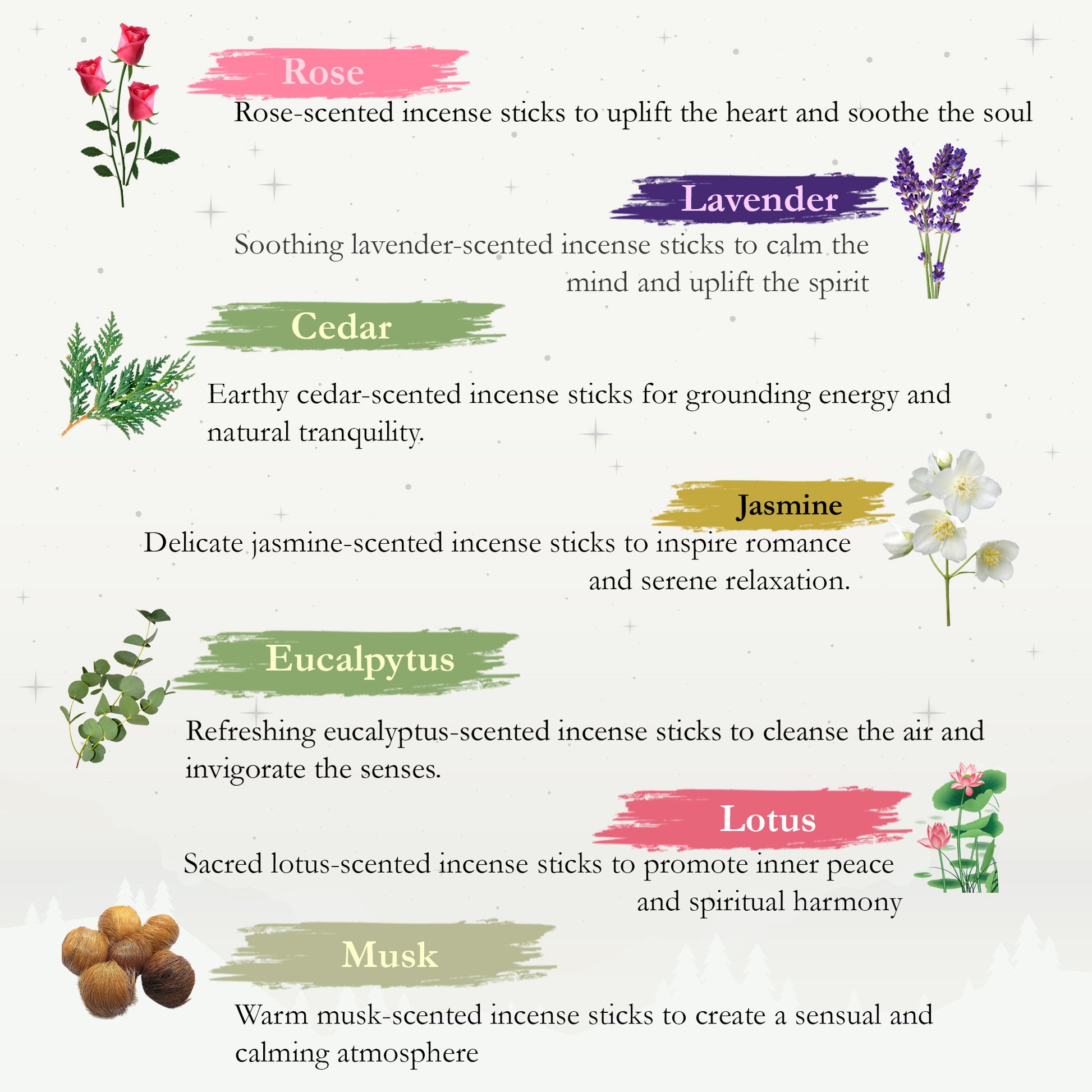 +Incense sticks provide a traditional experience, cones offer deeper aroma, and backflow cones create a meditative visual flow of smoke.